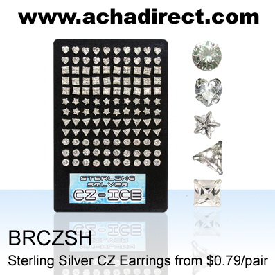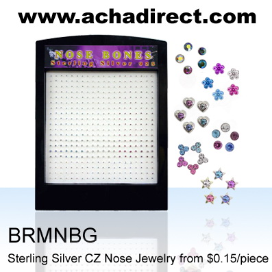 Board of 200pairs of sterling silver nose bones in mix color, shape crystal: round, flower, star, heart.