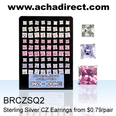 Board of 36 pairs, square shape mix color Cubic Zirconia earrings studs. Size 5mm. - 7mm.