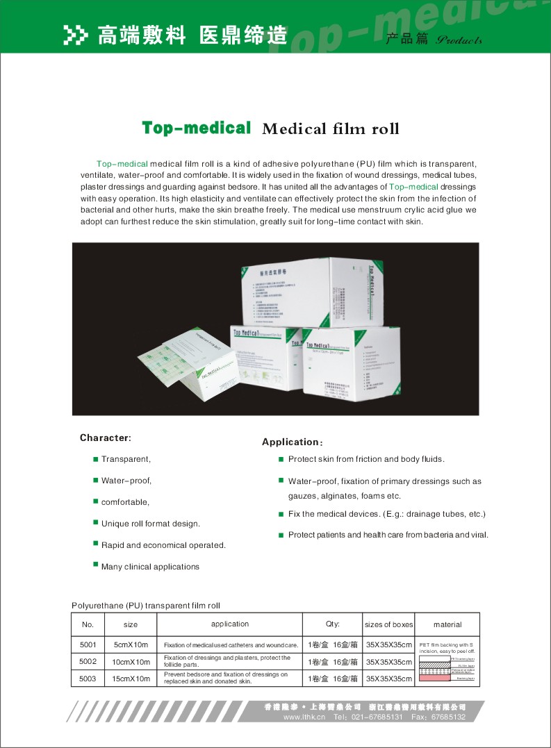 Medical film roll is a kind of adhesive polyurethane(PU) film which is transparent,ventilate,water-proof and comfortable.It is widely used in the fixation of wound dressings,medical tubes,plaster dres…