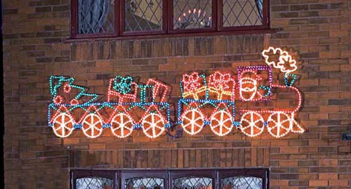 • This train rope light silhouette has a moving wheel and puffing smoke effect.