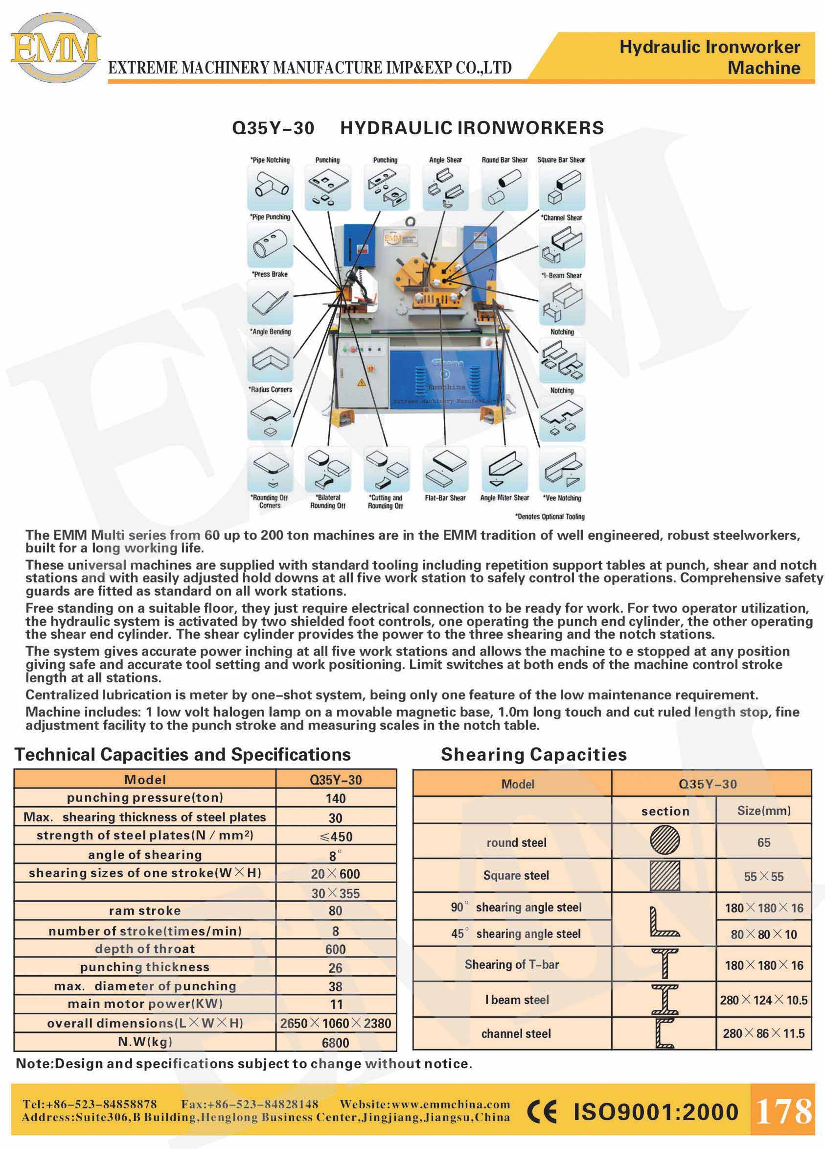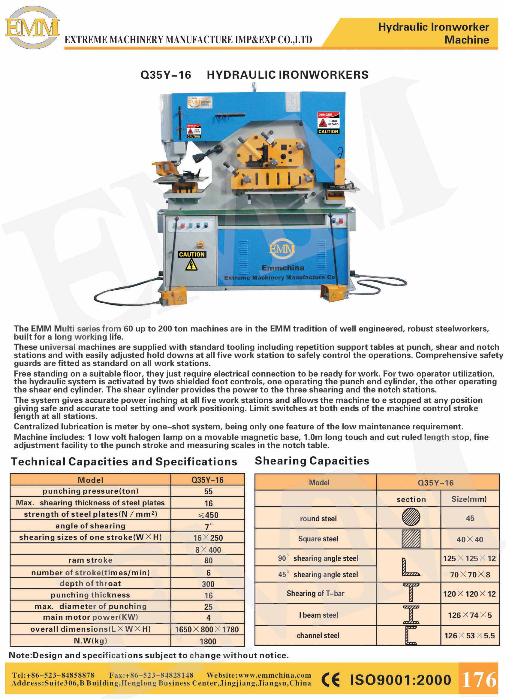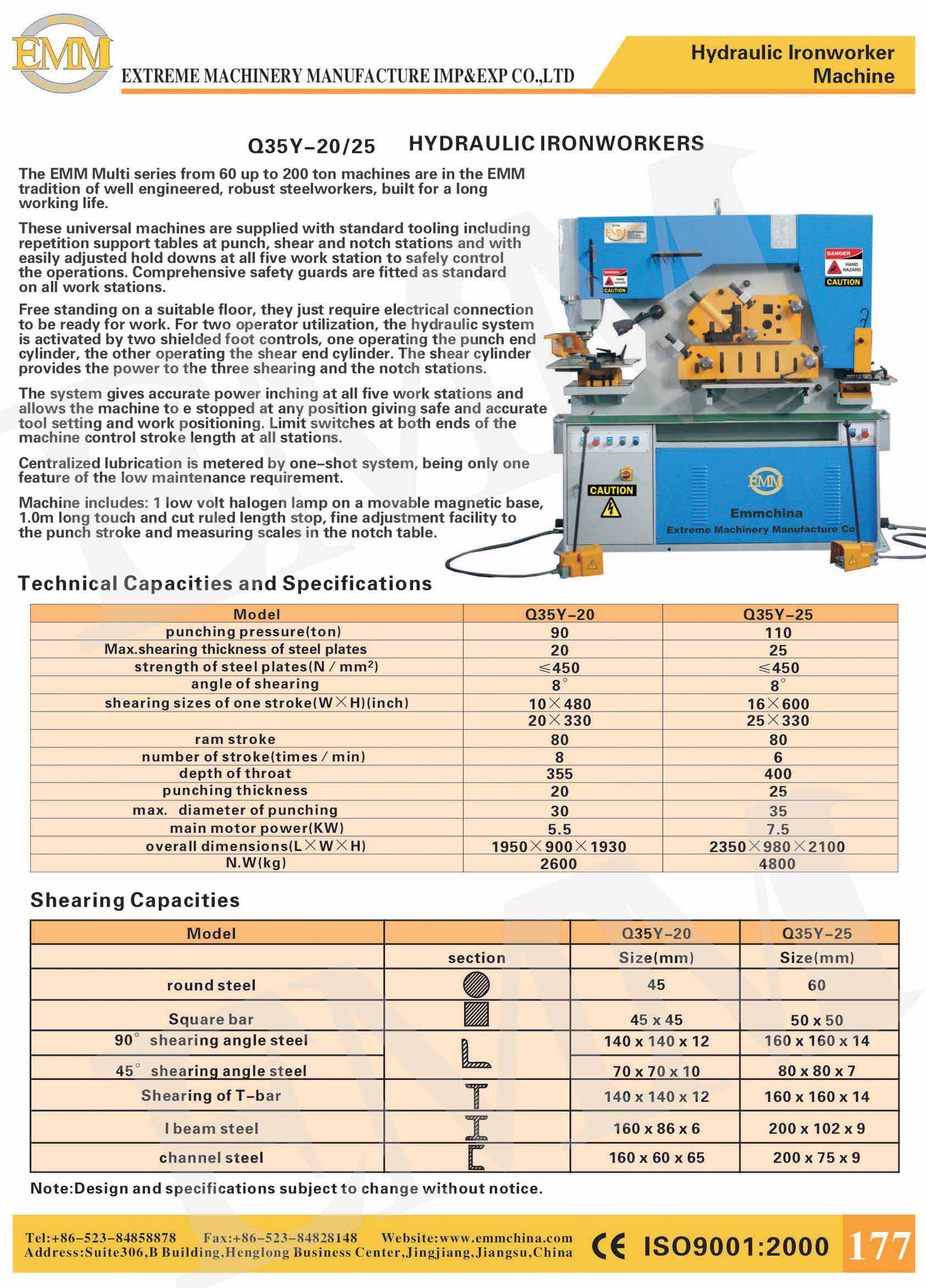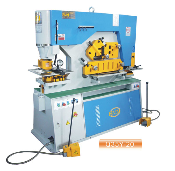 Due cylinder with two contral pedals.Single Phase 55 Ton 5 Stations Ironworker. Includes 5 Stations with Oversized Work Tables for Punching, Flat Shearing, Angle Shearing, Bar Shearing, and Rectangle …