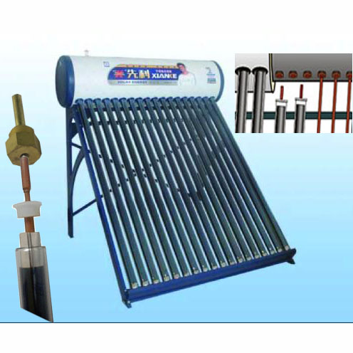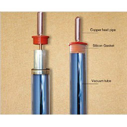 Solar vacuum tube with straight copper heat pipe, there is anti-freeze liquid inside as medium transfering of heat. By the design the water never Come into vacuum tube immediately so the tube will nev…