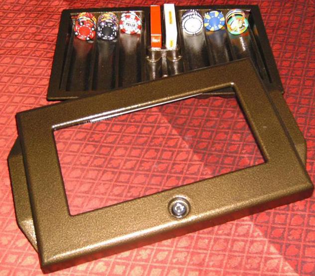 Keep your chips under lock and key with this Aluminum Chip Tray and Cover with cutout. Protect your investment with this chip tray with Cutout Size 14" x 8 1 / 2". Lock included!