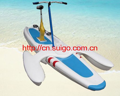 A human-propelled water bicycle suitable for training or recreative purposes. The water bicycle has two steerable front pontoons and two rear pontoons fixed to a main frame substantially similar to a …