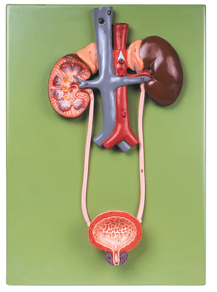 1. Shows the structure of the urinary system, including kidney, ureter, bladder,