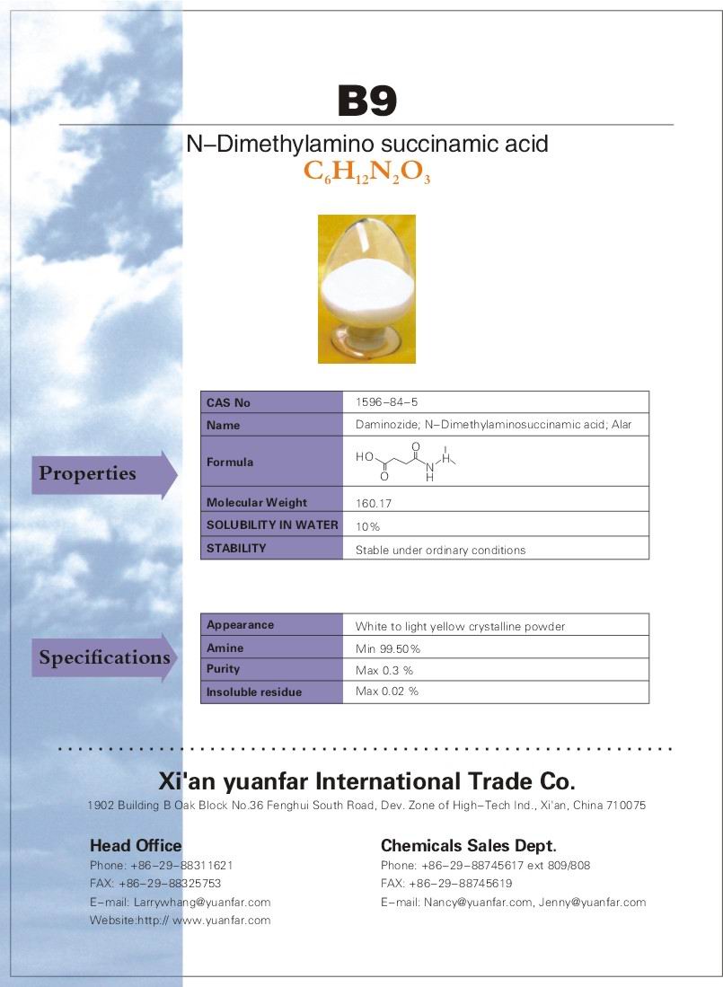 B- Nine(N-Dimethylamino Succinamic Acid) is a growth regulator,which controls the excessive growth of the dicotyledon.It can be used as followinngs: