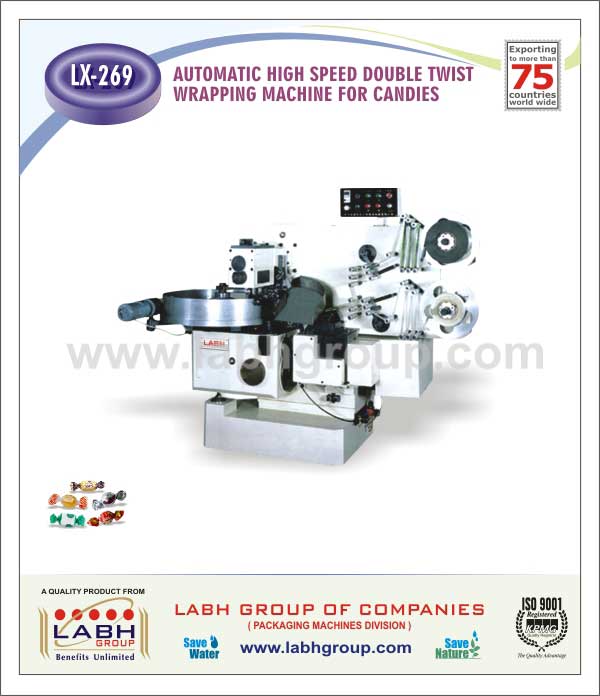 Automatic High speed double twist wrapping machine to wrap the hard boiled sweets and candies by twisting the wrapper from both the end