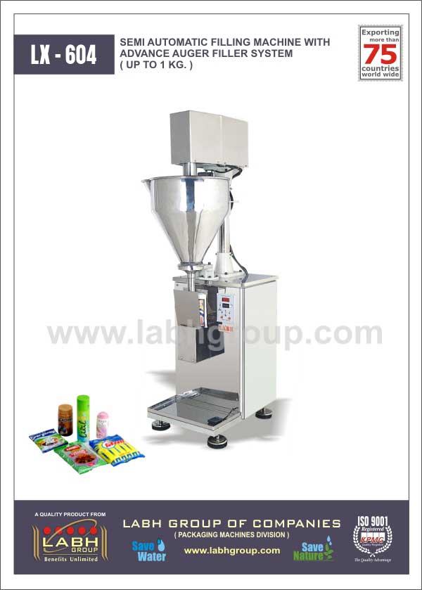 Semi automatic, advance electronic load cell based, weigh-metric filling machine with advance auger filler system to fill various powders like Flour, Spices, Milk powder, Dyes powder, Detergent powder…