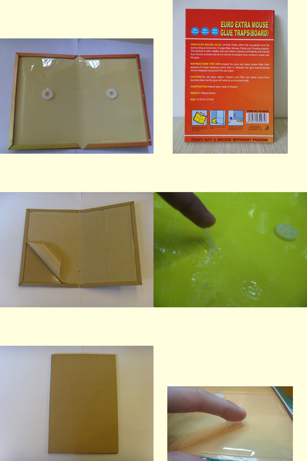 1 Strong adhesive 2 Obourtess 3 easy to use 4 safe and stanitary 5Glue weight:30-40g size:185*125*9mm/193*131*10mm/216*168*7mm price:0.35USD/pc(FOB) packing:100pc/carton payment:T/T deliv…