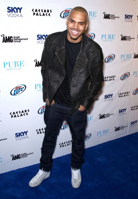 Chris Brown celebrated his 22nd birthday at Pure Nightclub in Las Vegas wearing a studded leather jacket, Levi 's jeans, and a All White Christian Louboutin Star Sneakers.