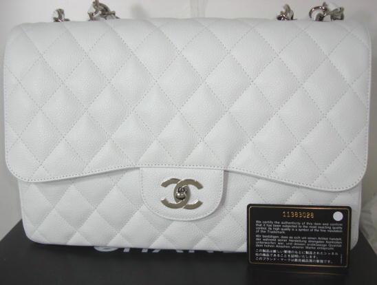 This is a 100% BRAND NEW & AUTHENTIC CHANEL 07P JUMBO WHITE CAVIAR LEATHER CLASSIC BAG with FLAP. It measures about 12" across; 8" High; 3 1/2" Wide and the Double Silver Chains with WH…