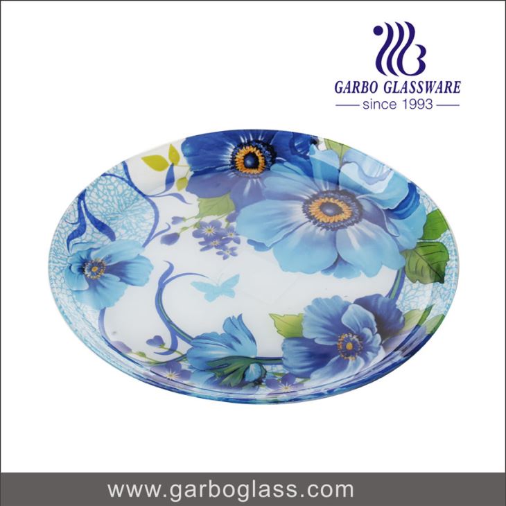 9 Inch Round Flat Glass Dinner Plates With Decal Flower Design Beautiful For Dinning Room Or Decorative,Glass Dining Plates url:http://www.garboglassware.com