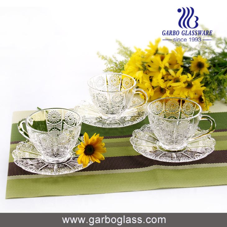 Middle East Style Sunflower Design Of Crystal White Quality Glasses Mug And Saucer Sets For Drinking Tea Or Coffee At Home Or Cafe,Cups And Saucers Sets url:http://www.garboglassware.com