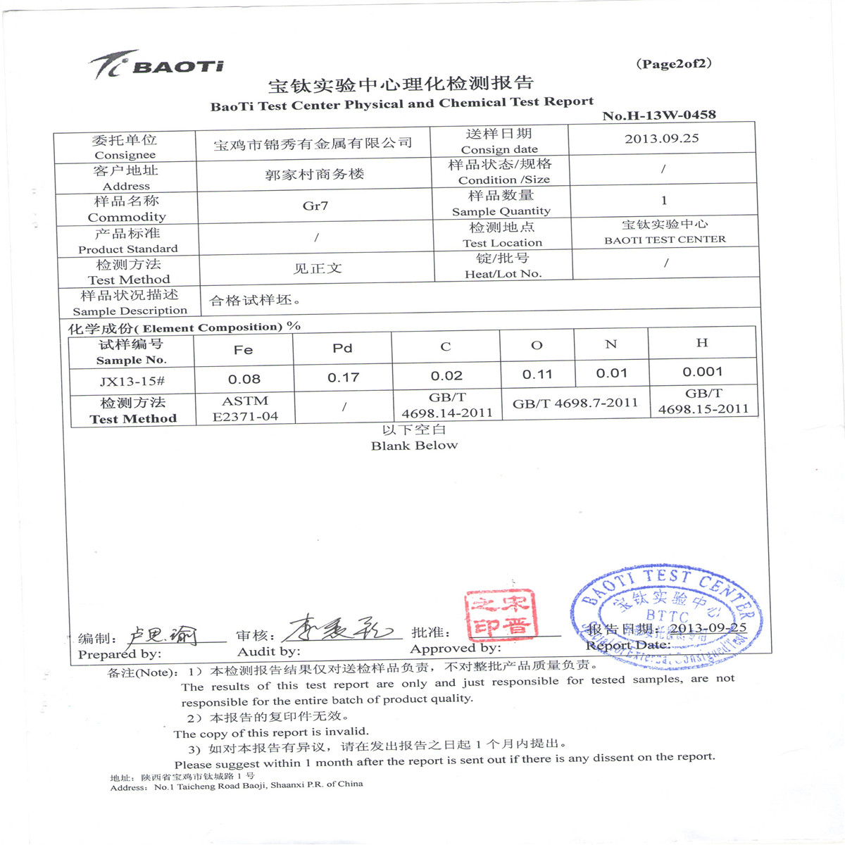 Baoti Test Center Physical and Chemical Test Report