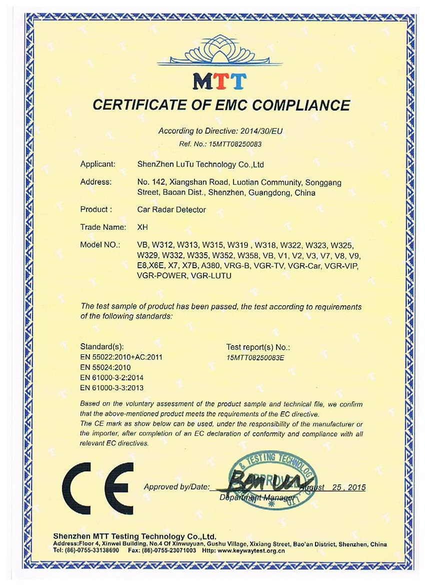 Focusing on products that are truly superior and innovative, LUTU has been awarded ISO9001 Certification, our products have passed the international certification Design Patent, CE, FCC, RoHS, CCC etc and grown to become one of the largest manufacturers and exporters of Radar detector products in China.