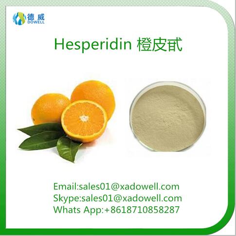 Main Functions: Hesperidin is a flavanone glycoside (flavonoid) found abundantly in citrus fruits. Its aglycone form is called hesperetin.Hesperidin is believed to play a role in plant defense. It acts as an antioxidant according to in vitro studies. In human nutrition it contributes to the integrity of the blood vessels.Various preliminary studies reveal novel pharmaceutical properties. Hesperidin reduced cholesterol and blood pressure in rats. In a mouse study large doses of the glucoside hesperidin decreased bone density loss. Another animal study showed protective effects against sepsis. Hesperidin has antiinflammatory effects.. Hesperidin is also a sedative, possibly acting through opioid or adenosine receptors.