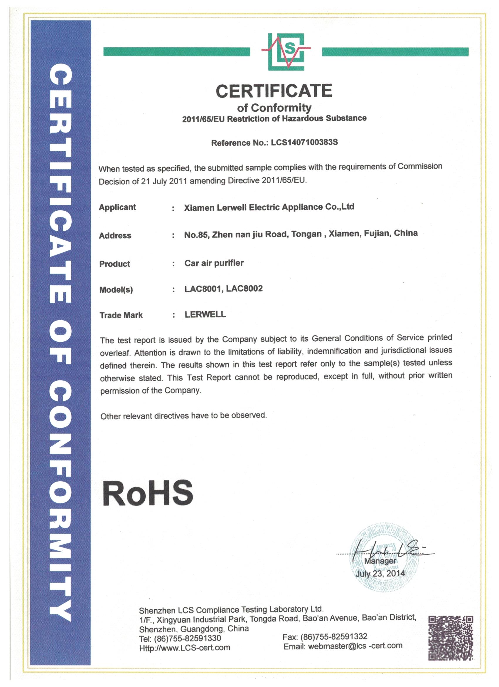 Xiamen Lerwell Electric Appliance Co.,Ltd is a manufacturer who focus on design and produce the Intelligent health appliance equirement like Air Purifier,Car Air Cleaner, Mosquito Killer Machine for OEM or ODM. Lerwell controlls products quality in according with ISO managing systems, All of products have passed international approvals of CE, RoHS, (c) ETL, GS and more.