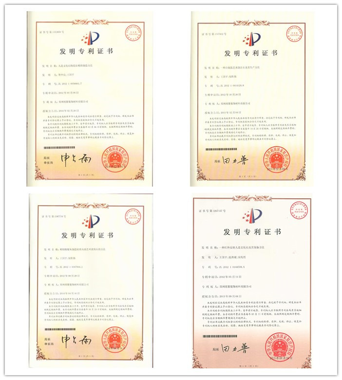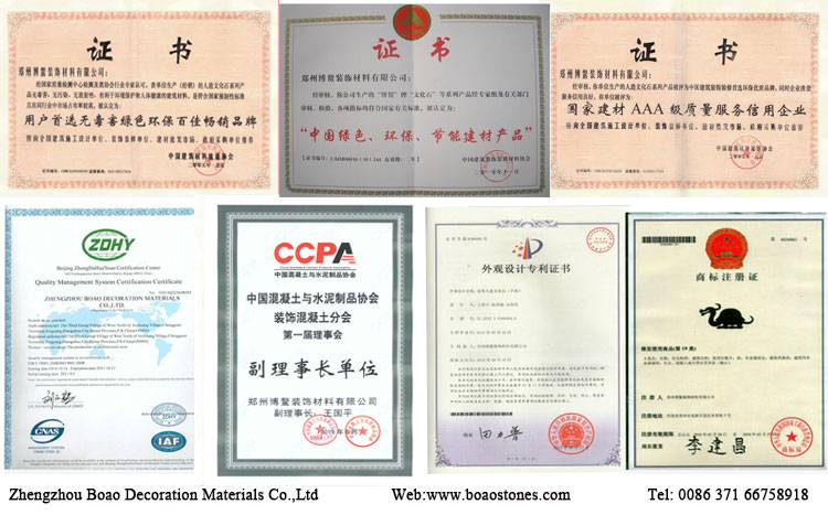 After over a decade of steady development and innovative operation, Bo’ao has forged an industrial chain that links the factory production, R&D, marketing and export trade of building materials featuring new building and decorative ones, and established a mode of industrial structure characterized by standardized operation. Manufactured stone veneer products are subject to rigorous testing and Bo’ao cultured stone is one of the most evaluated. The company has passed the "Double High" authentication successfully (i.e. Henan Province high and new-tech enterprise and products), ISO9001 authentication of quality system in 2000; Chinese Building AAA Materials Quality Service Enterprise, The User First Choice and Best-Selling Brand because of its nontoxic, The Green & Environmental Quality Credit, Energy Conservation and Demonstration Unit in the building materials industry.