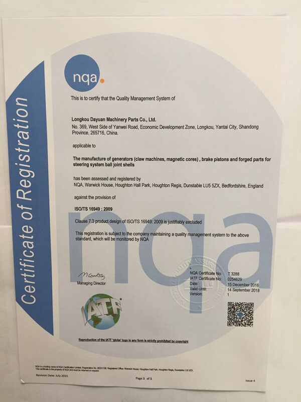 Longkou Dayuan Machinery Parts Co., Ltd. currently is the first domestic company that is a high and new technology enterprise (HNTE) with international advanced level on precision cold forging production process(Cold Extrusion) . It is professional on a large scale to produce cold forging claw pole and magnetic core for all kinds of automobile alternator, brake caliper piston, steering ball joint, steering-gear spherical housing, flange, coupling shaft, and petroleum perforating housing etc. We can manufacture almost all kinds of cold forging parts based on customers’ approved drawing. We develop and produce product molds by ourselves. The annual production capacity for cold forging claw pole reaches to 8,000,000 sets.