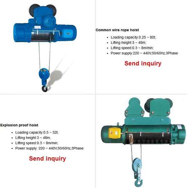 Model CD1, MD1 wirerope electric hsoit is a small-sized lifting equipment, which can be mounted on single beam, birdge , gantry  and arm cranes. With slight modification, it can also be used as a winch. It is widely used in factories, mines, harbours, warehouses, cargo storage areas and shops, es sential in raising working efficiency and improving working conditions.