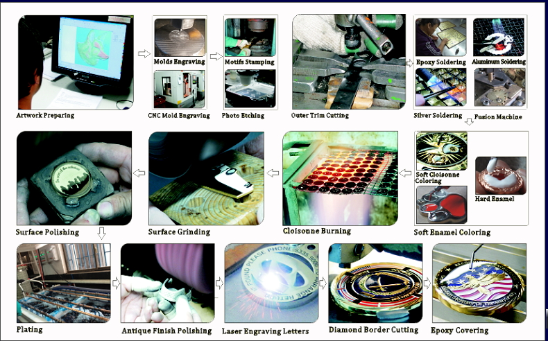 Production process: Artwork preparing – Mould making – Stamp – Accessory Fixing– Polishing – Plating – Color filling – Epoxy adding – QC – Packing