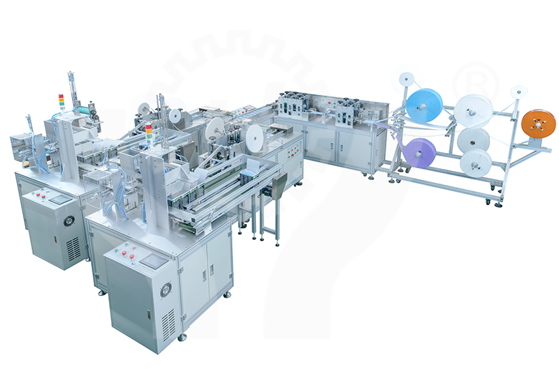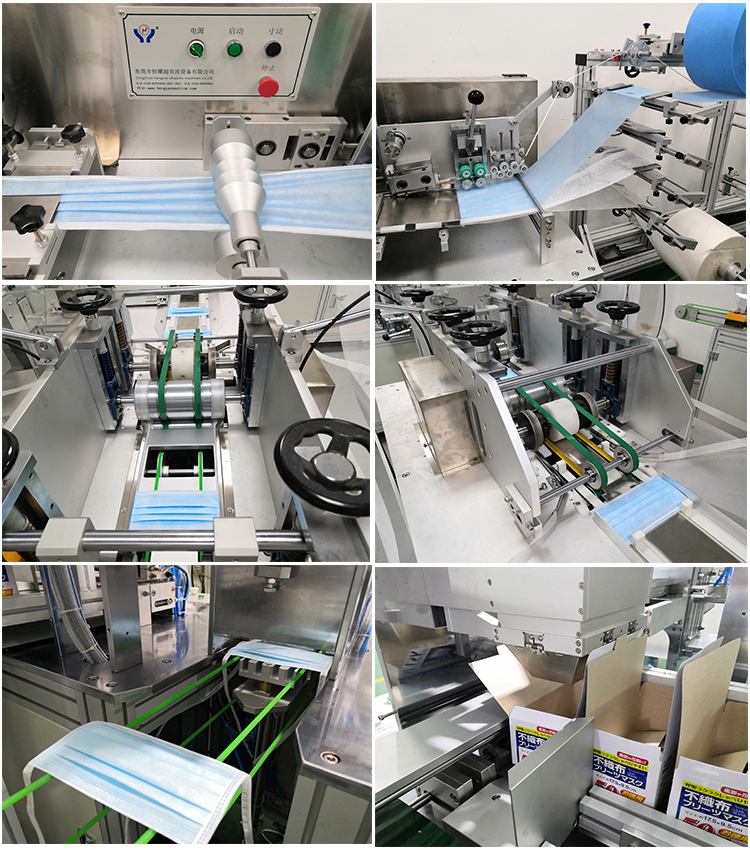 It is an automatic machine to produce the finished surgical tie on face mask ,and welding by ultrasonic .From material feeding for produce face mask blank to welding the edge, this machine integrate 1 set face mask bank machine with 2 sets of tie on machines by the mask distribution system ,so that improved its automation . In the meawhile , machine also can box feeding automaticlly. Only 2 person are needed to operate.