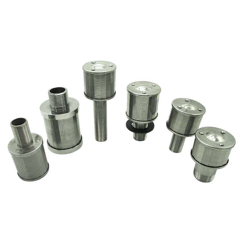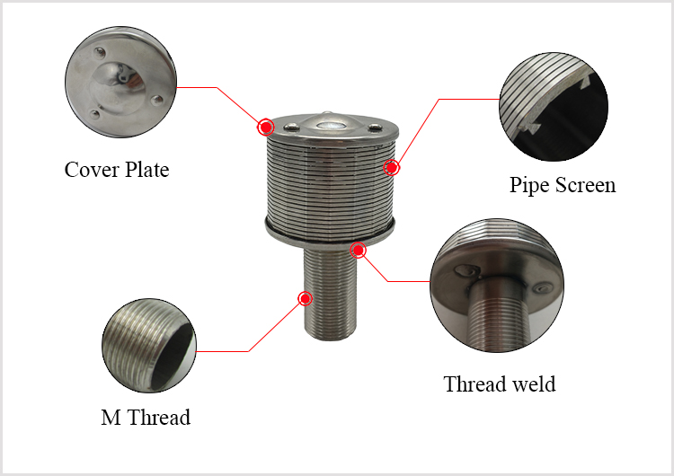 Wedge wire water treatment sand filter nozzles are made from V-shaped profile wire, which is spirally wound around a cage of longitudinal support rods. Each intersecting point of these wires is fusion welded, with a unique welding process. This spacing gives passage for water to enter. The entire process is completed on fully computerized machines. The pitch of winding gives different spacing between two adjacent turns of wire.