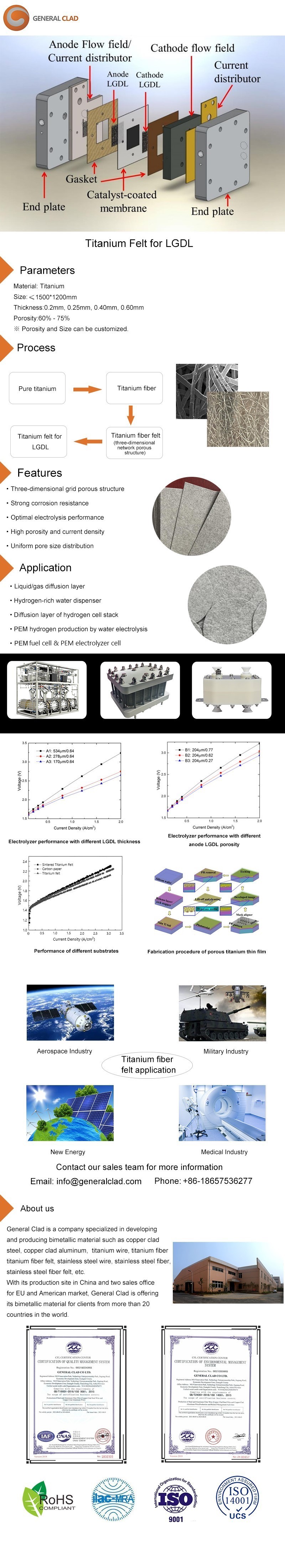 itanium fiber felts are primarily used in electrolyzer stacks as the flow field or diffusion layer material, particularly on the oxygen (anode) side. Since electrolyzer hardwares cannot use carbon-based gas diffusion layers (GDLs) at the oxygen evolution electrode due to immediate oxidation of carbon to CO2 (if the medium is acidic) or carbonate ions (if the medium is basic) during the electrolysis reaction, titanium fiber felt becomes an ideal diffusion medium and also provide electrical contact between the anode catalyst layer and bipolar plate or current collector component at the anode side.