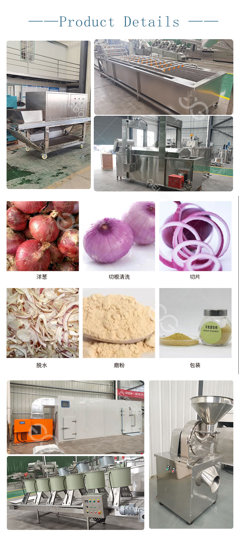 It includes onion multi-layer dryer, dehydration onion vibrate feeder, onion grinder, onion plan sifter, dust collector.