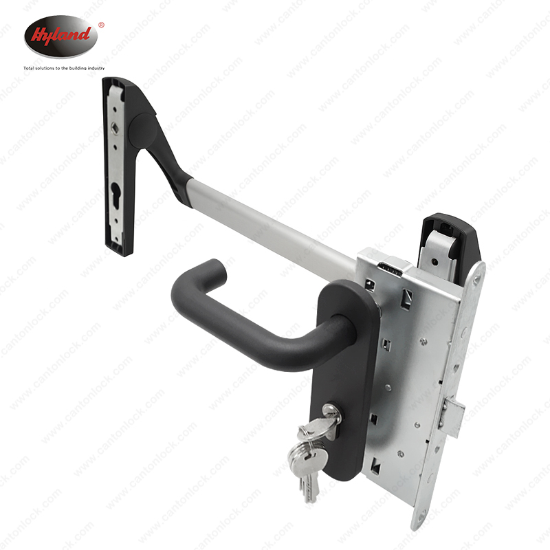 Kale cylinder with 3 keys for external operation; panic bar for internal emergency exit.