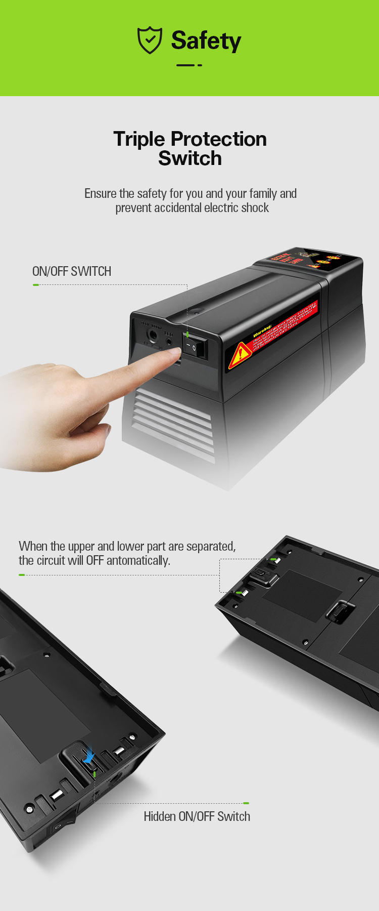 4. When the top and bottom parts are separated, the circuit is completely OFF. And it will be power on after two parts assembled in right way.