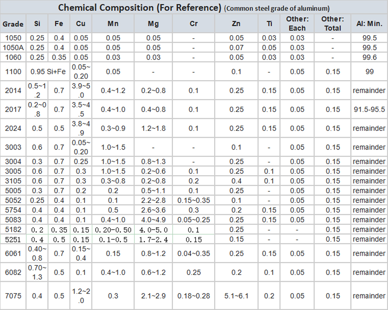 Alloy | 5000 series: 5052 5754 5083 5086 6000 series: 6061 6063 6082 3000 series: 3003 3004 3005 3105 1000 series: 1050 1060 1100 |